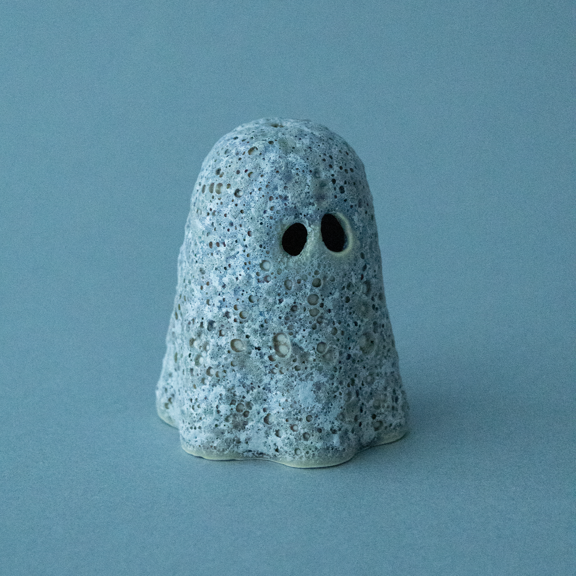 在时间与火焰的流动中依然残存的岩石——残岩。以模拟熔岩流淌后冷却的表面为灵感的釉料呈现出岩绿与岩青两种色调。它可以作为香炉使用,用于点燃香锥,并附有一个黑土香托,展示了未上釉的土壤裂纹纹理。由于所有的幽灵都是手工制作的,因此送到您的产品可能与照片不完全相同,但它们使用相同的技法创作,呈现出在“融化形状”主题下的各种形式。