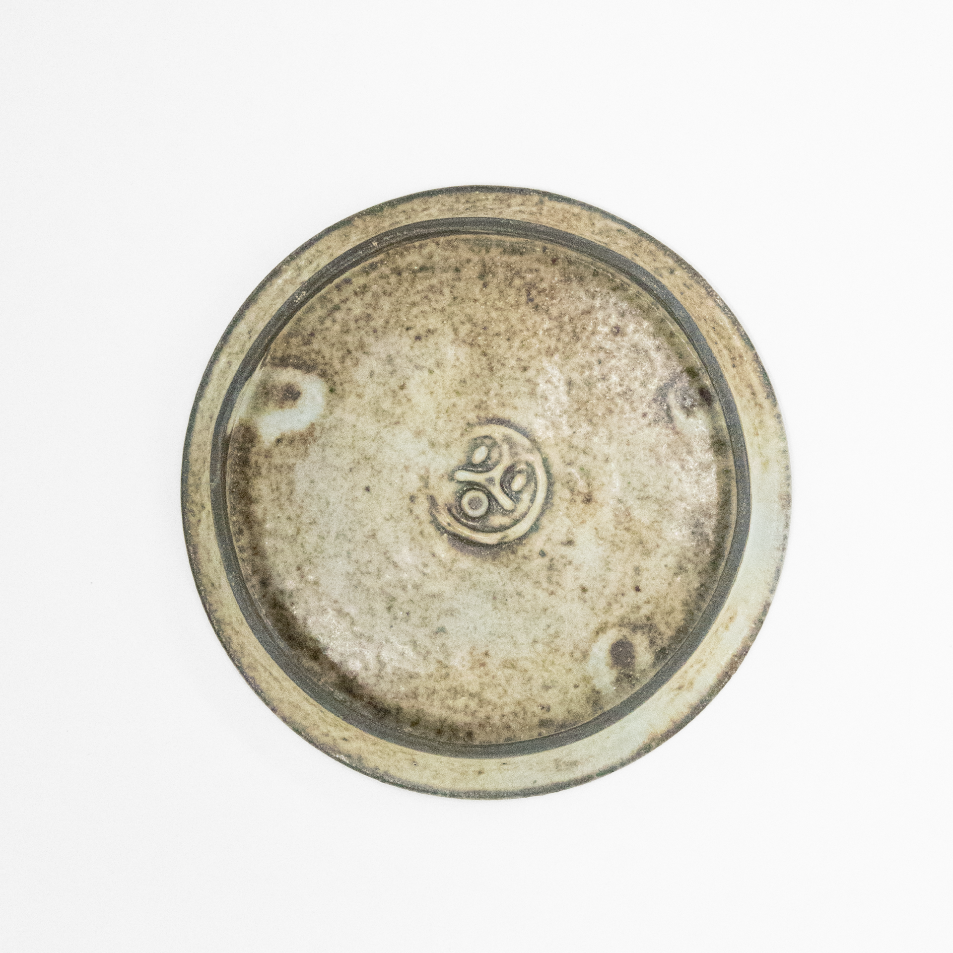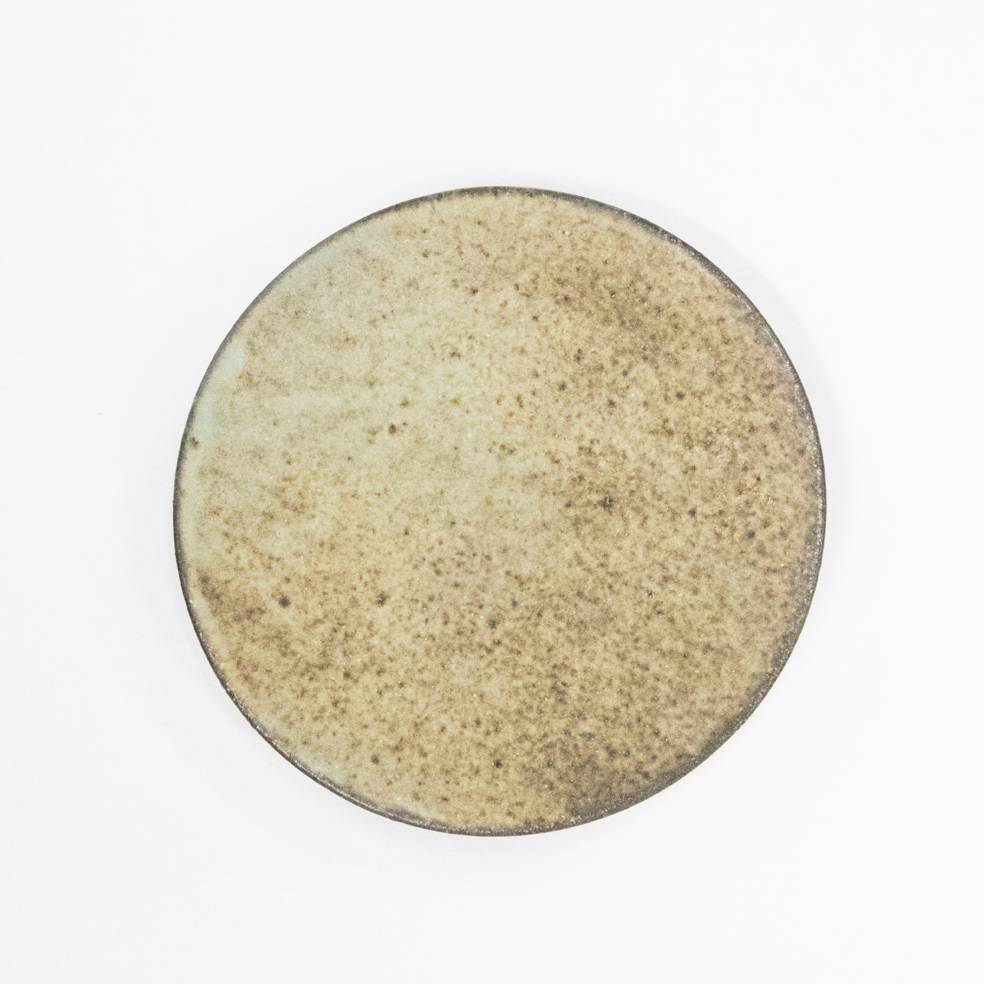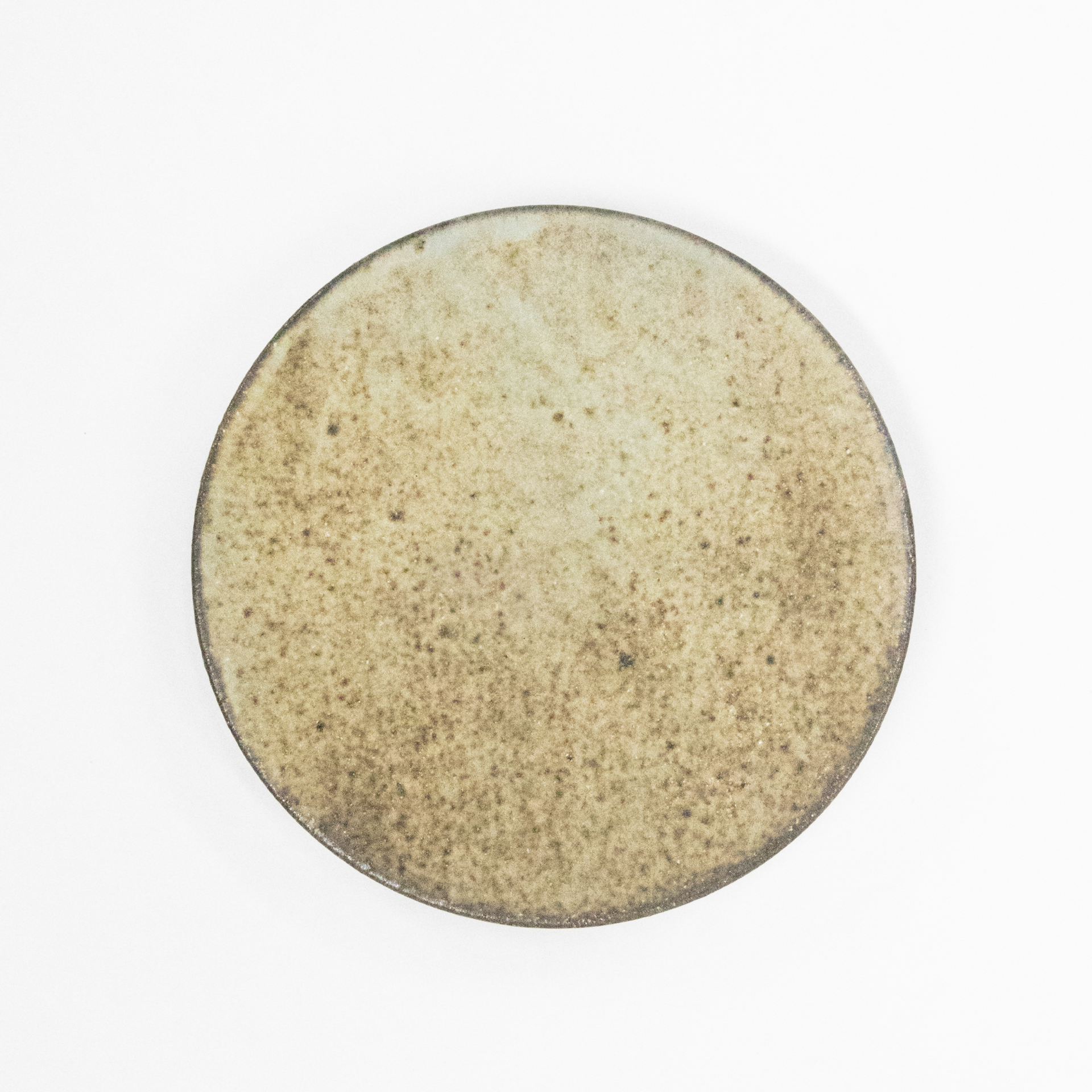 A small plate with a slightly rough surface, approximately 11 cm in diameter and 1.5 cm in height.